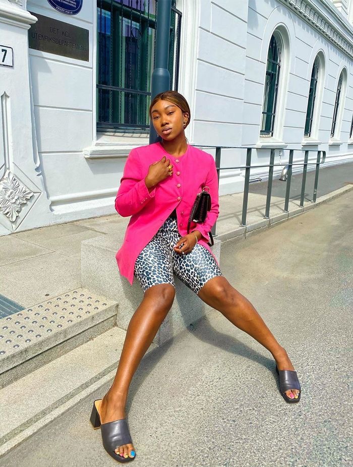 Looking to infuse a little dainty femininity with your bike shorts outfit? If you’re looking to minimize the sporty aspect of this mid-thigh garment, consider adding preppy pieces in pastel cardigans like this layered look. We love the addition of the matching headband and shoes.